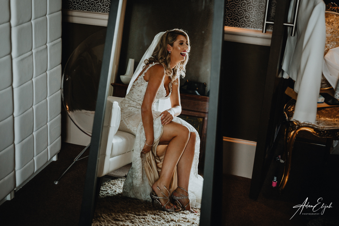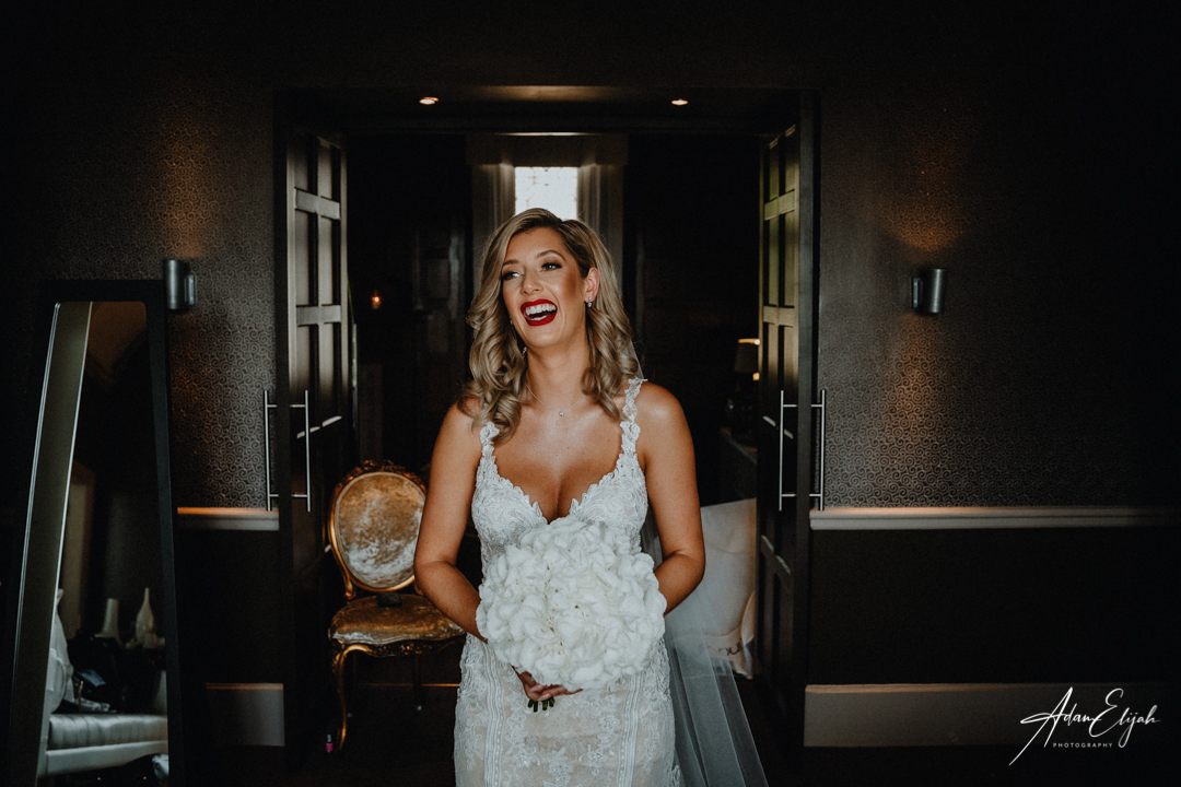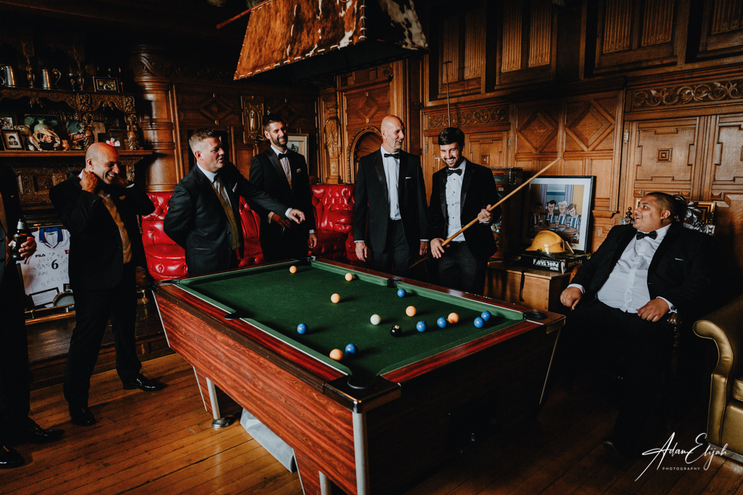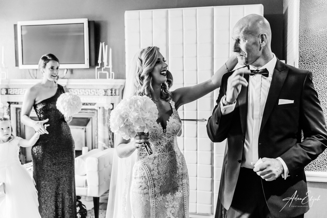 When I got to the bridal suite the girls were in a joyful mood, with lots of laughter, dancing and gin drinking. The first tear of the day belonged to Katie’s father during the first look, and you could understand why as Katie looked stunning in her dress. Whilst the girls got dressed I nipped to meet the lads in the games room where they were enjoying a game of pool and a few beers from their own personal bar. The perfect environment for the gents who all looked very dapper in their black and white suits.